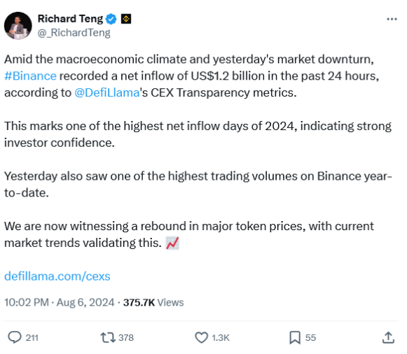 Binance, the world’s largest cryptocurrency exchange, saw a net inflow of $1.2 billion within 24 hours earlier this week.