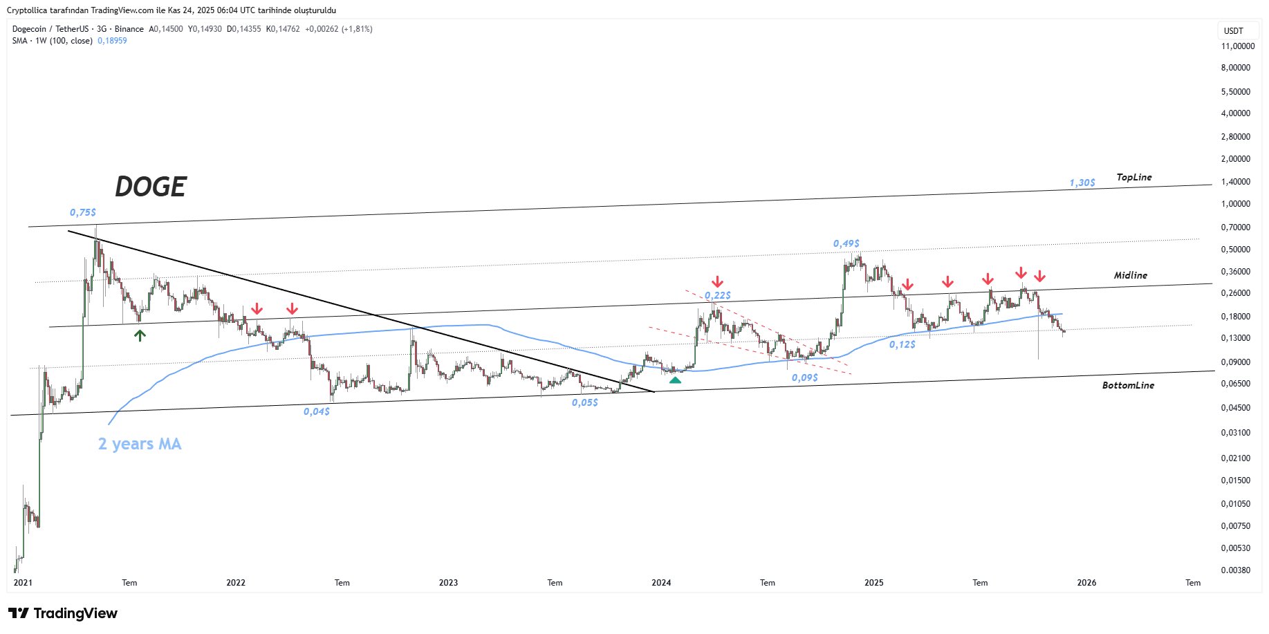 Dogecoin Long-Term Channel Analysis. Source: Cryptollica on X