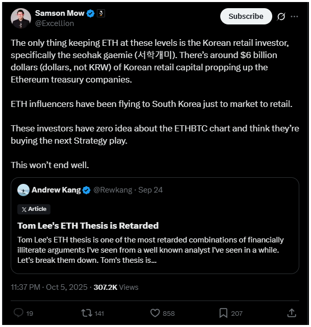 Mow calls out a cult of seohak gaemie, the South Korean retail traders, who’ve been wooed by crypto influencers jetting into Seoul, pitching these Ethereum treasuries as the next big strategy play.