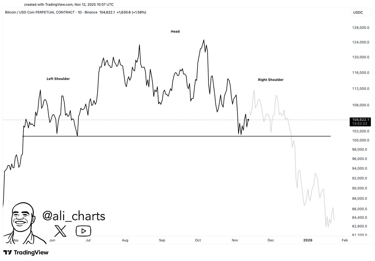 Crypto analyst Ali said Bitcoin may be forming a head-and-shoulders pattern on the daily chart, signaling a possible shift in trend.