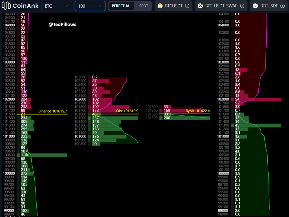 Market watcher Ted highlighted a buildup of buy orders between $100,500 and $101,000 on Binance’s order book.