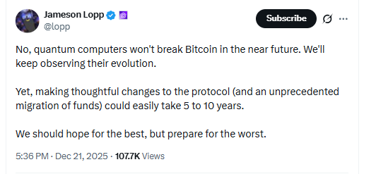 Lopp said quantum computers do not pose a near term quantum computing threat to Bitcoin. However, he said the work and the fund migration would still take years.