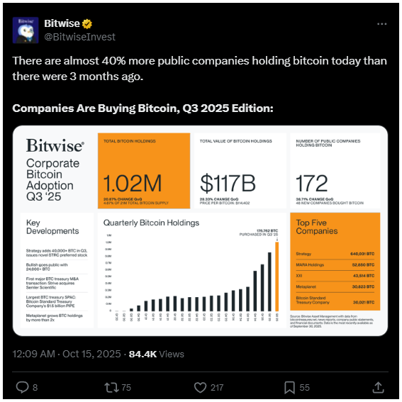 Bitwise shared that between July and September, 48 new public companies jumped on the Bitcoin bandwagon, increasing the total number of firms holding BTC by 38%.