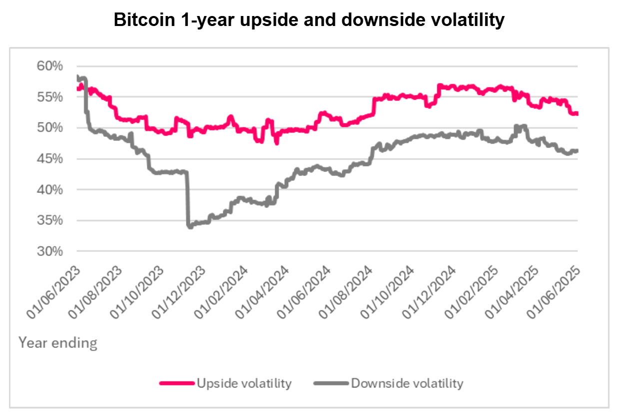 Sygnum also points out something interesting about Bitcoin’s volatility. Over the past three years, the upside swings have outpaced the downside.