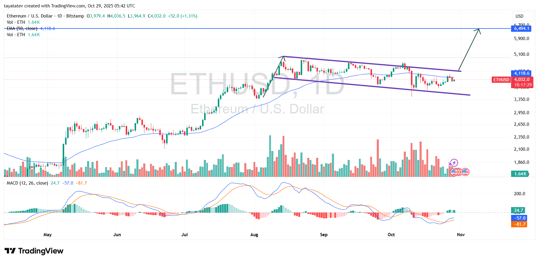 The flag formed from the August peak and now guides price between parallel trendlines while ETH holds near $4,032.
