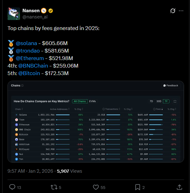 BNB Chain lagged 2025 fees but stacked wins everywhere else