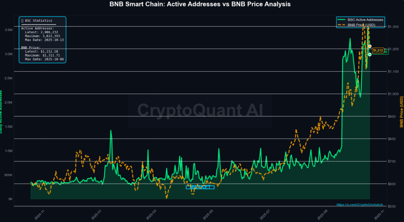 Of course, after the hype, BNB’s price cooled off to around $1,212, and addresses slipped below 3 million.