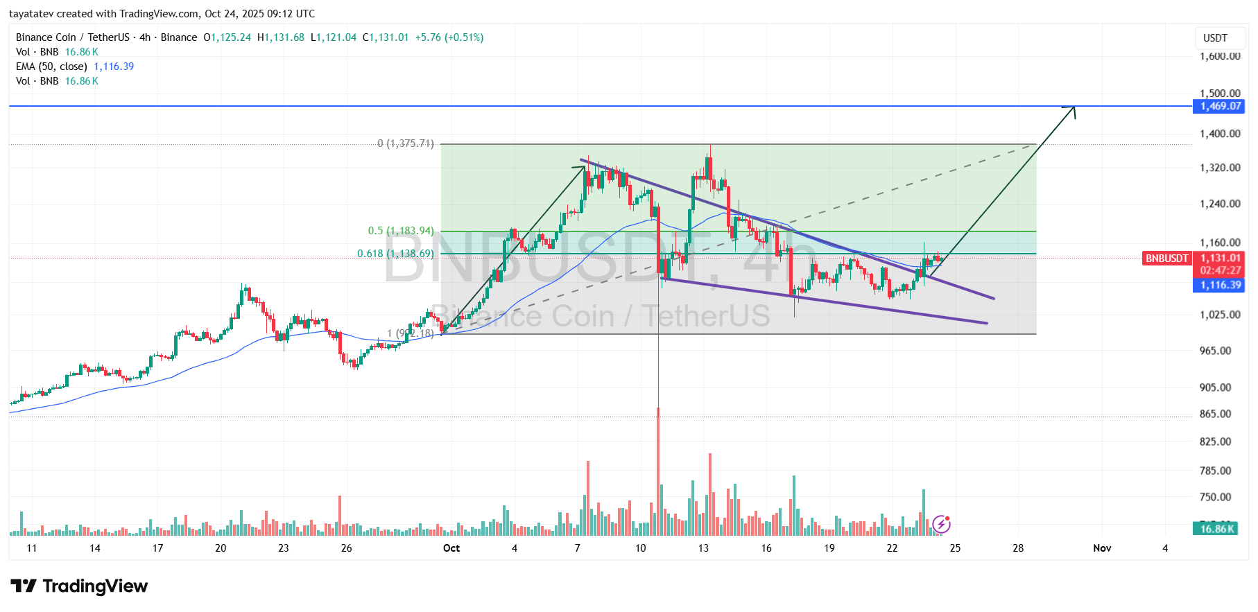 Binance Coin (BNB) broke upward from a four-hour falling wedge on Friday, Oct 24, 2025, and pressed about 4% above the pattern’s upper trendline.