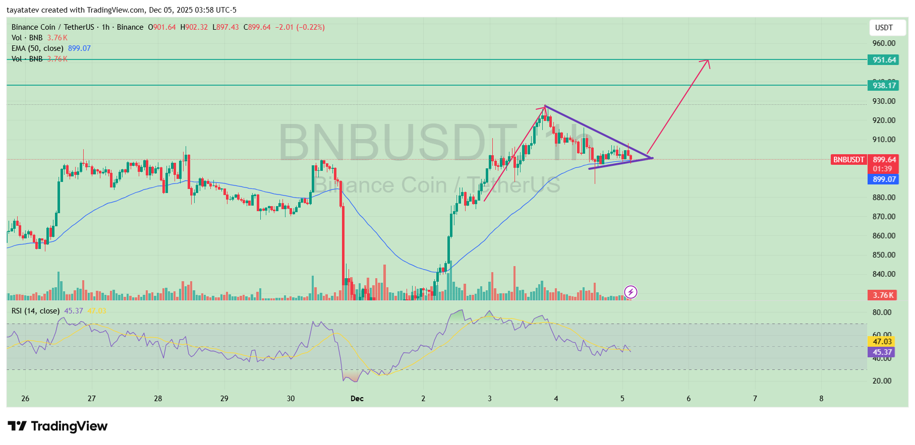 The height of the triangle measures roughly 52–55 dollars from base to top. If BNB breaks out near the current area around 899–900 dollars and respects the 50-EMA as support, the measured move points about 6 percent higher, toward roughly 951–954 dollars.