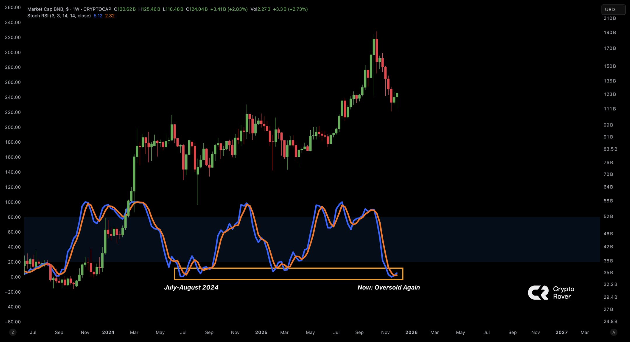 Crypto Rover frames this setup by noting that BNB shows its lowest Stoch RSI reading since the summer of 2024 and calls the token “severely undervalued.”