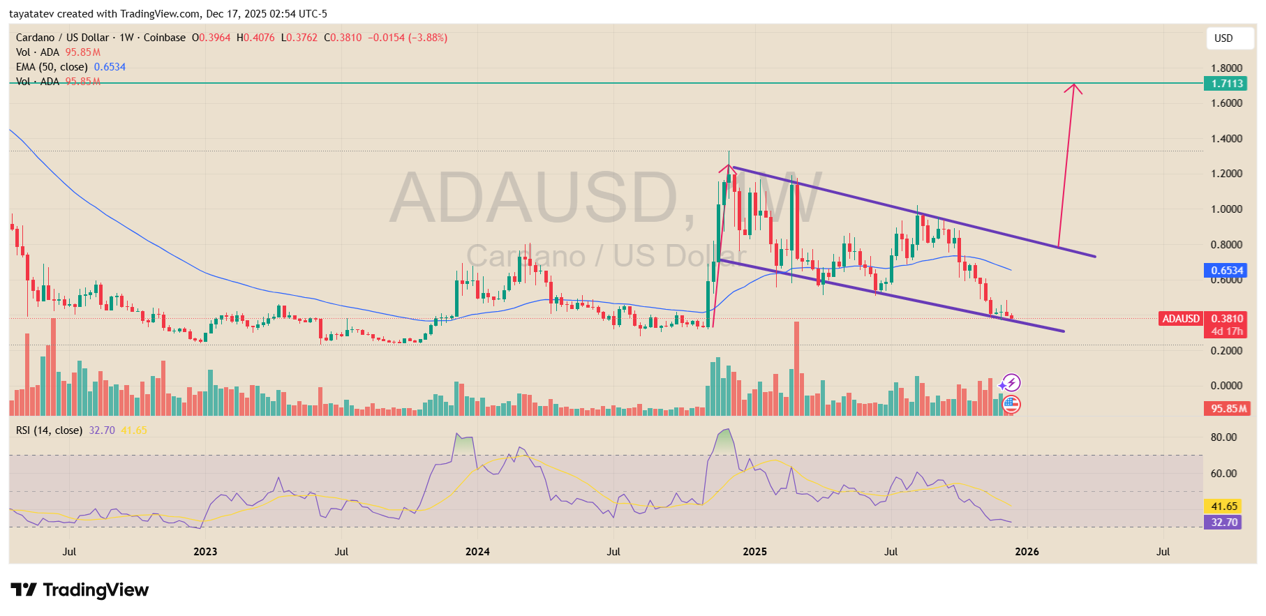 At the same time, ADA trades well below the 50 week EMA near $0.65, which signals that price is still deep in the consolidation phase.