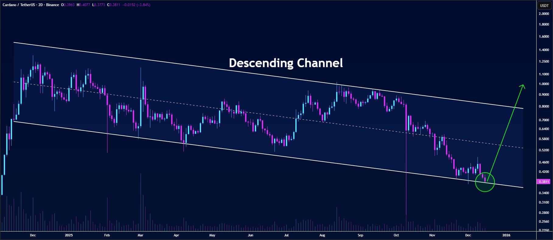 Here, Cardano surged sharply in late 2024, then entered a controlled pullback inside a descending channel. Since then, price has respected both the upper and lower boundaries of that channel, which confirms the flag structure.