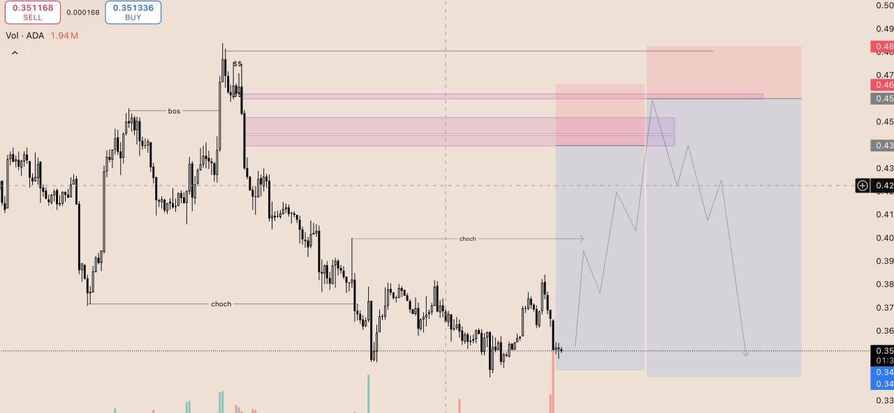 The shared chart showed ADA around $0.351 with the latest swing low marked near $0.34021.