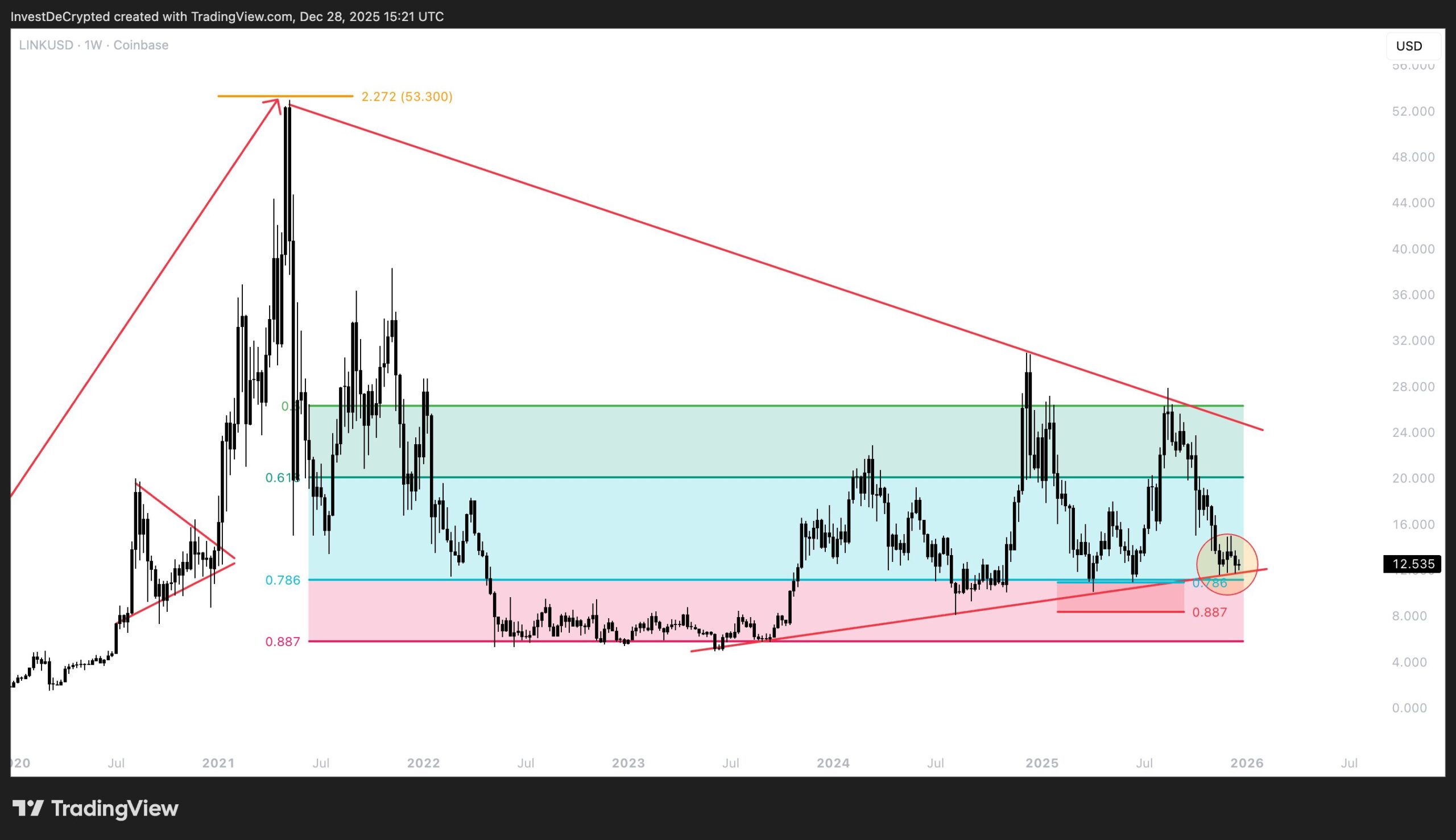 The chart maps a large Fibonacci retracement range across the multi year move. LINK now trades around the 0.786 area, with the lower band near the 0.887 level acting as the next downside reference.