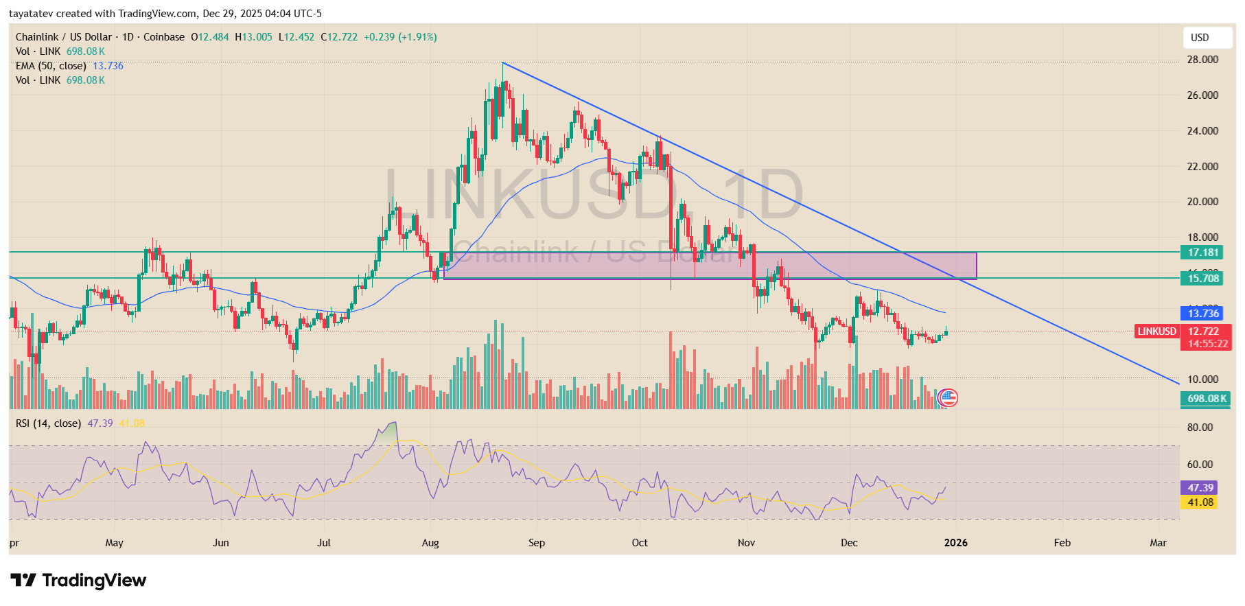 As of the latest daily close, LINK trades near $12.7, holding well below both the descending trendline and the 50 day exponential moving average.