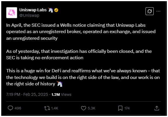 This is huge for Uniswap and the whole crypto industry, signaling a possible shift in how the SEC handles cryptocurrency regulation.