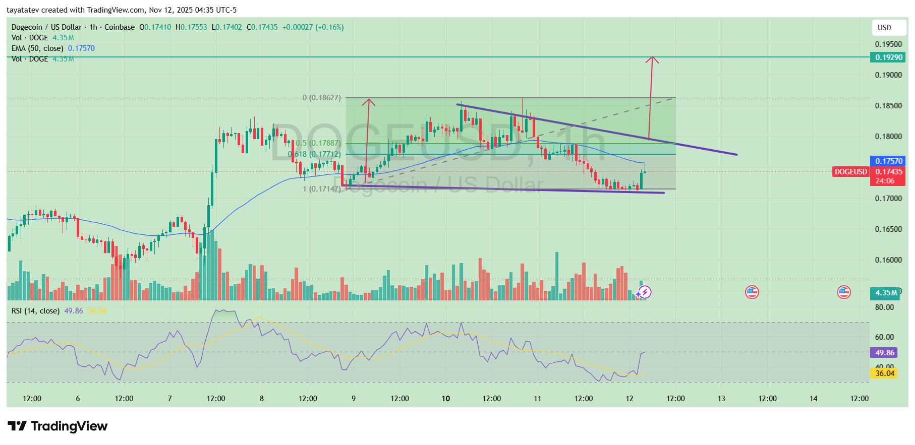 Dogecoin’s 1-hour chart shows a falling wedge from the ~$0.1868 swing high to the ~$0.1714 base, while price rebounds off support near $0.171–$0.172.