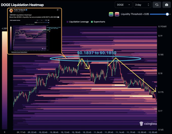 Dogecoin’s recent pullback followed a sharp rejection from the $0.1837–$0.1839 range, where more than $10 million in liquidity had accumulated, according to data from Coinglass shared by Trader Tardigrade.