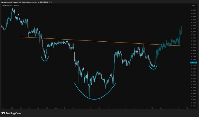 Dogecoin’s chart shows a confirmed inverse head and shoulders pattern after breaking above its neckline resistance.
