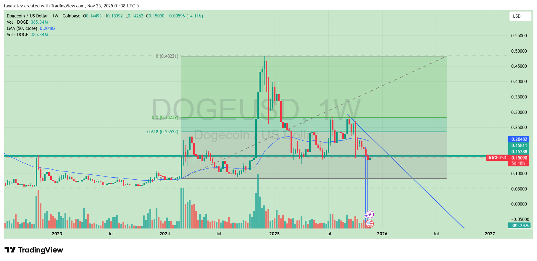 Additionally, the long-term shaded Fibonacci projection zone extends toward the previous $0.48 peak. The chart illustrates how Dogecoin historically accelerates once it breaks through the 0.382 area, though it remains well below that threshold for now.