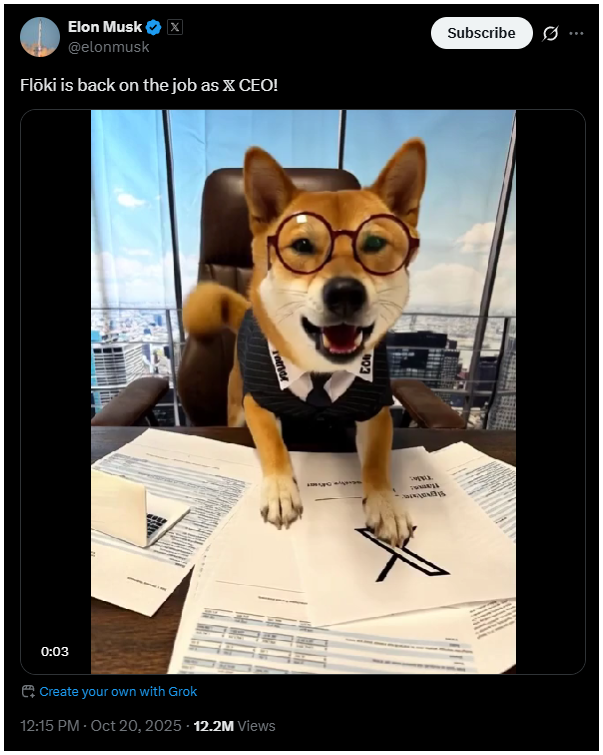 The backstory adds spice. Musk named his Shiba Inu “Floki” back in 2021, sparking the birth of the FLOKI memecoin.