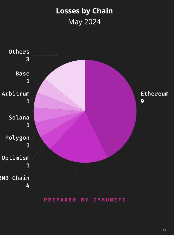 Not surprisingly, Ethereum was the most targeted platform, with nine incidents accounting for 43% of total losses, followed by the BNB Chain with 19% of the total.