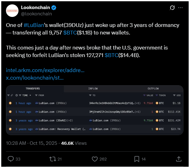 First, Lookonchain flagged 9,757 BTC moving to fresh addresses. That tranche was worth about $1.1 billion at the time. The wallet had been dormant for roughly three years.