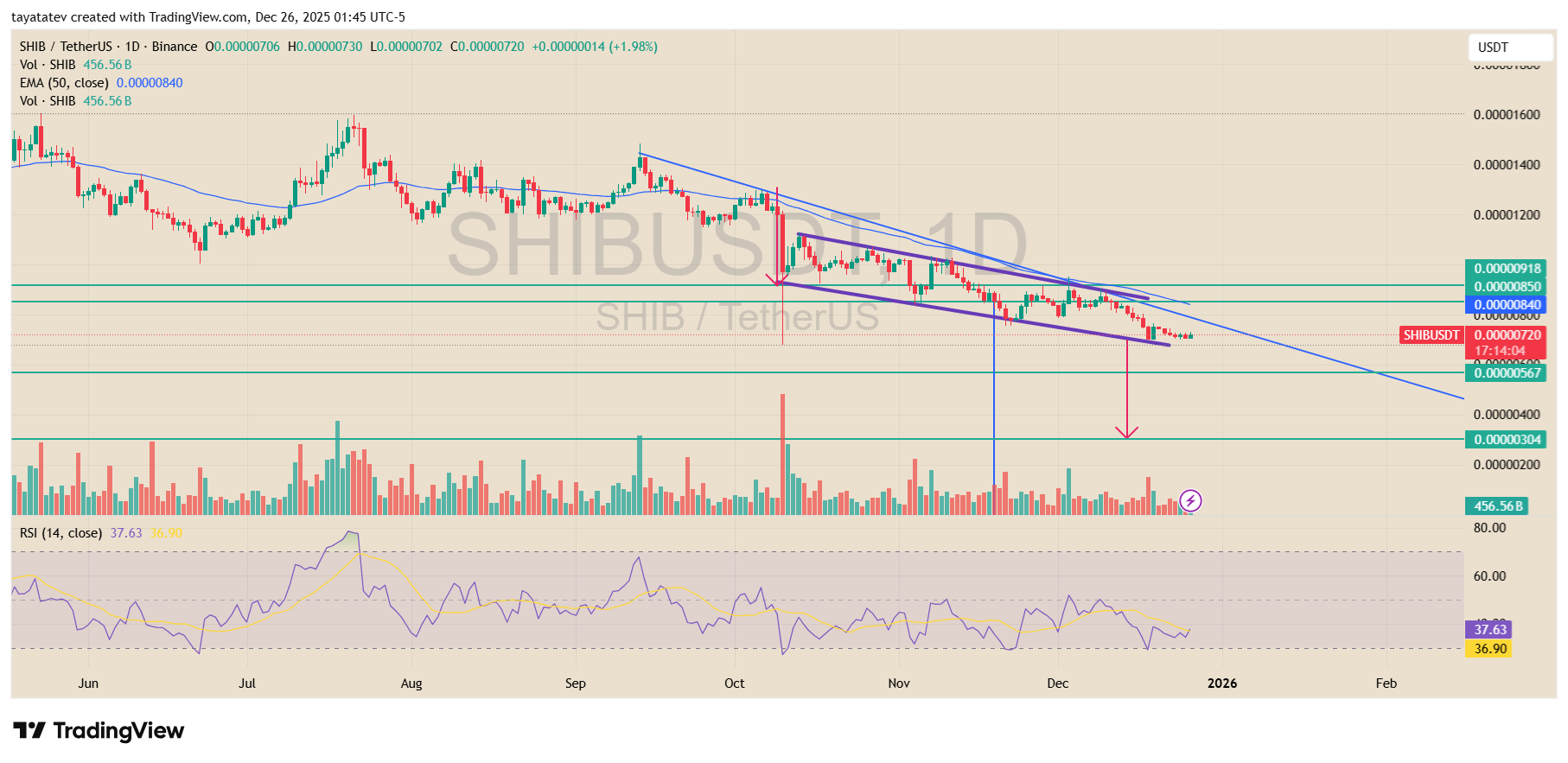 The daily SHIB USDT chart created on Dec. 26, 2025, shows price trading inside a clear descending channel that also fits the structure of a bearish flag.