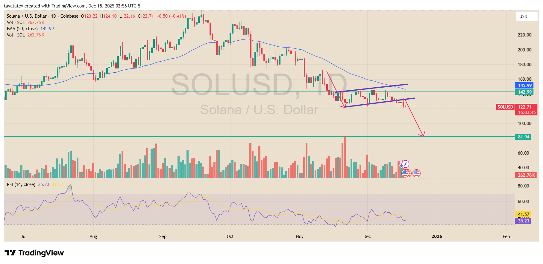 The TradingView chart, timestamped Dec. 18, 2025, shows SOL trading near $122 after a steady decline from the November highs.