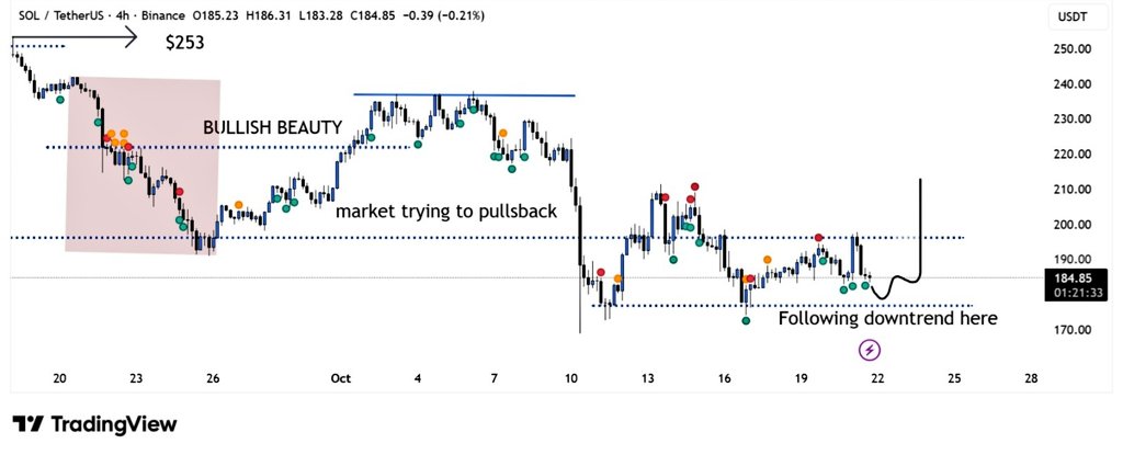 Solana trades near $185 on the 4-hour chart, defending a well-tested support band around $178–$182.