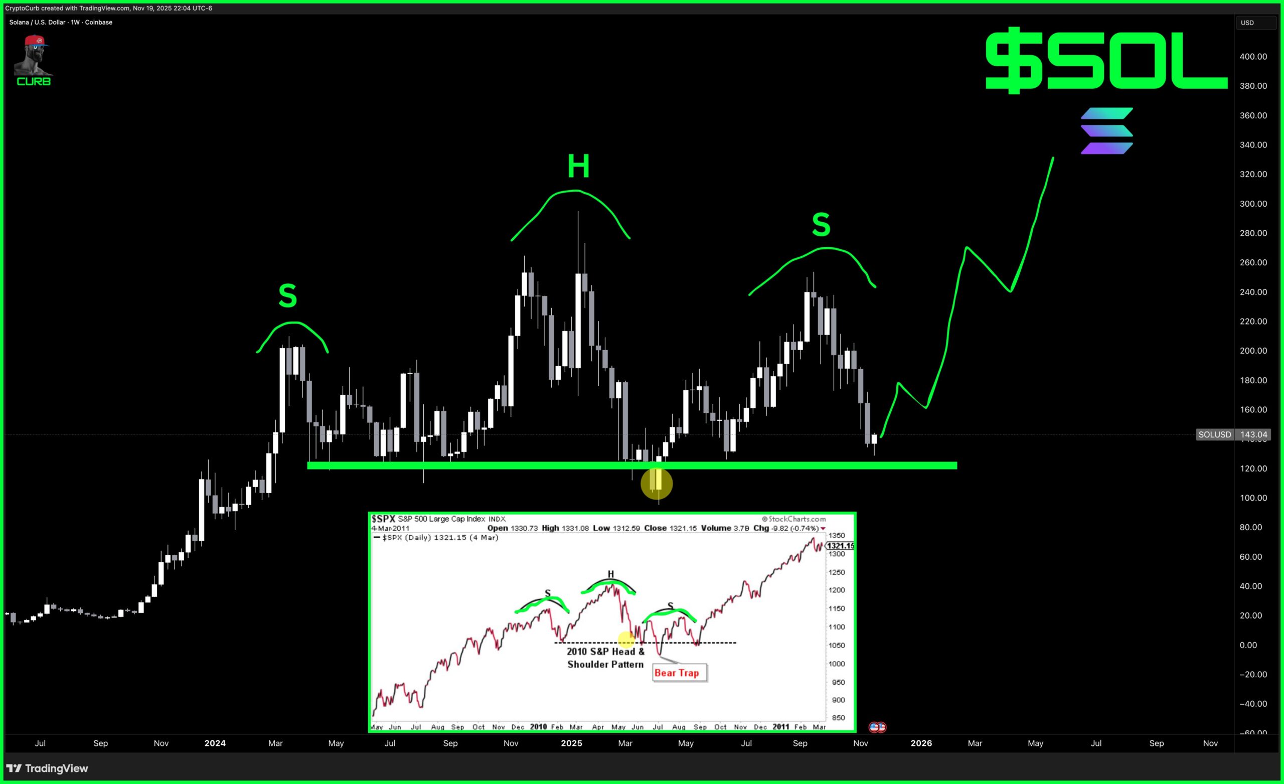 On the weekly SOL/USD chart, price has carved out a left shoulder, head, and right shoulder against a horizontal base near the $130 area.