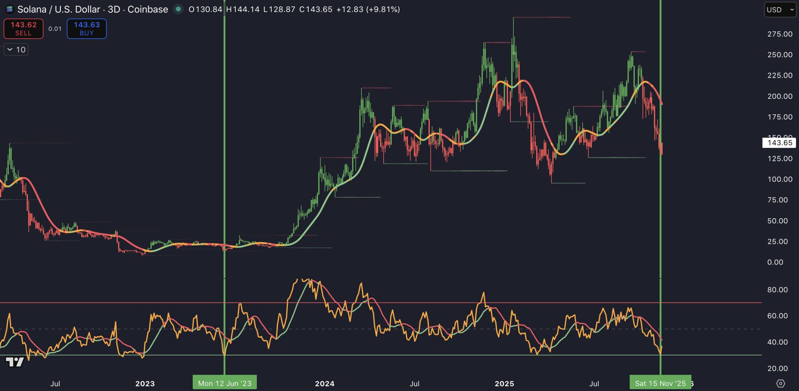 The divergence between today’s price and the old RSI floor highlights how aggressively momentum has cooled despite Solana holding a much higher level on the chart.