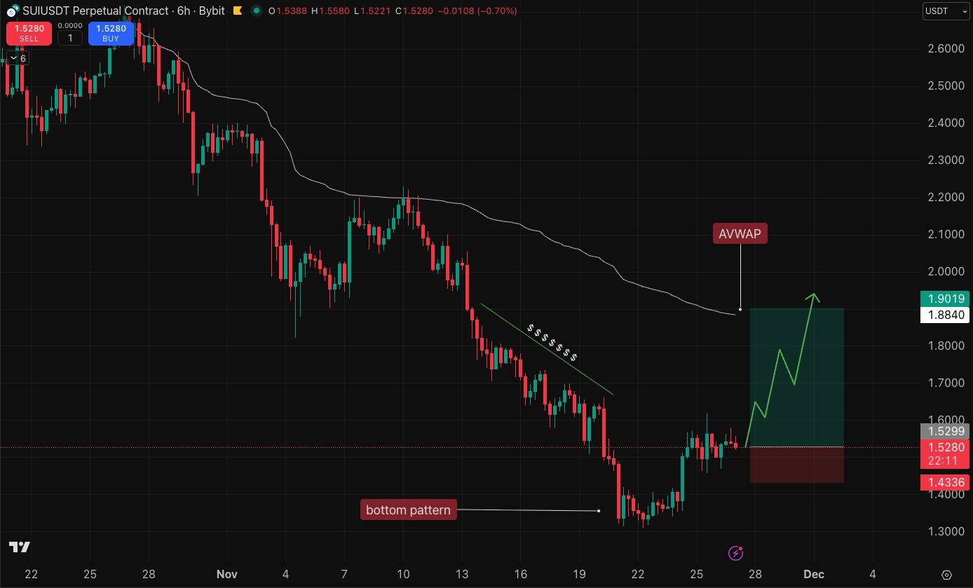 SUI/USDT on Bybit’s 6-hour chart shows a local bottom forming near 1.30 USDT in November 2025. Price declined in a steady downtrend, and then shifted into a reversal zone around Nov. 19–22.