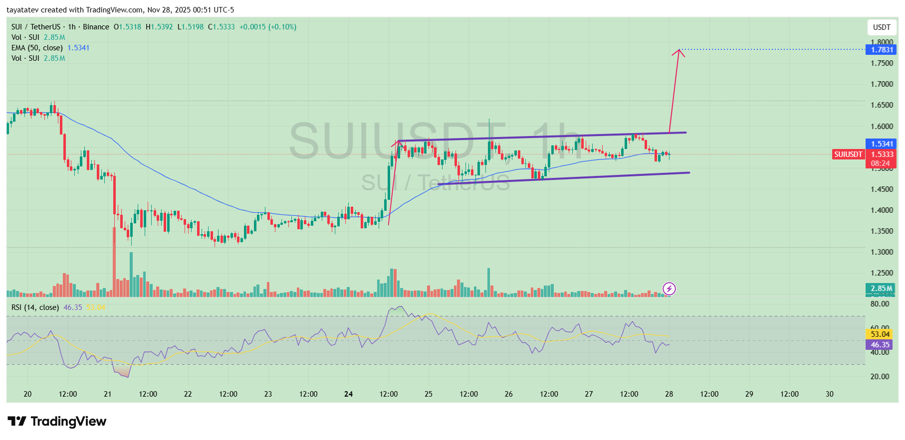 If the breakout completes the measured move, SUI may reach 1.783 USDT. The target comes from multiplying the current price by the breakout percentage (1.5333 × 1.161 ≈ 1.783).