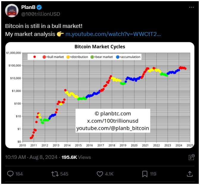 In a post on X, Ju told that Bitcoin is still in a bull market, reinforcing the sentiment shared by the crypto trader known as PlanB.