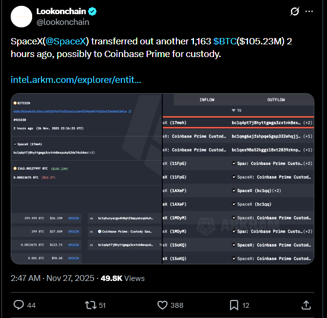 For months, the SpaceX wallets sat perfectly still, no transfers, no experiments, no hints of intent. Then, just six hours ago, the silence broke. Without warning, 1,163 $BTC , over $105 million, was pushed out of storage and split between two completely fresh addresses. No… pic.twitter.com/QNW7L0sXgu