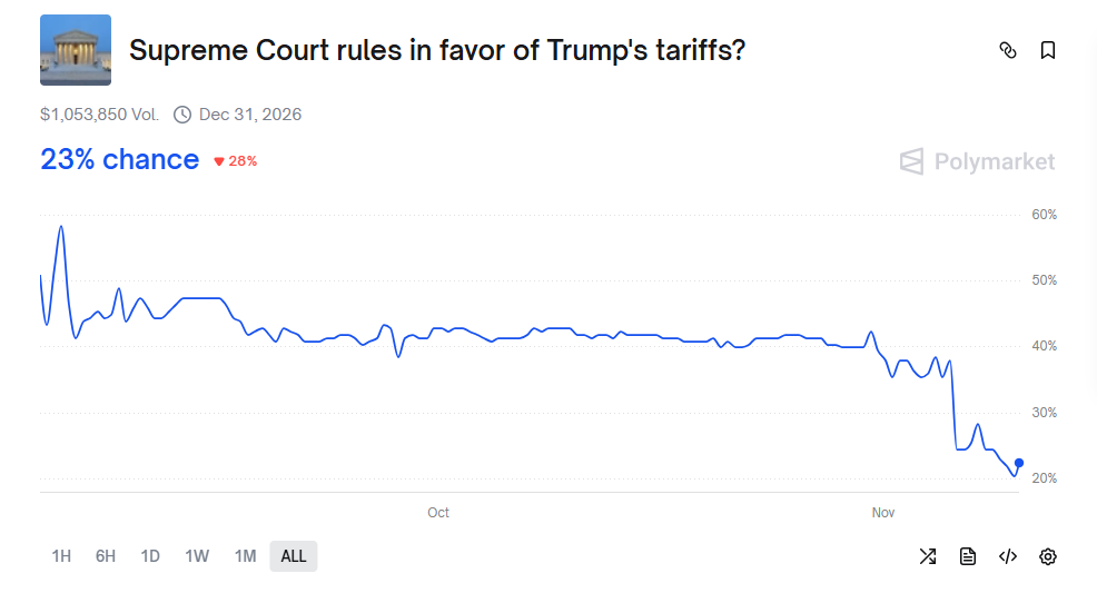 Prediction markets show low confidence in a favorable Supreme Court tariff ruling.