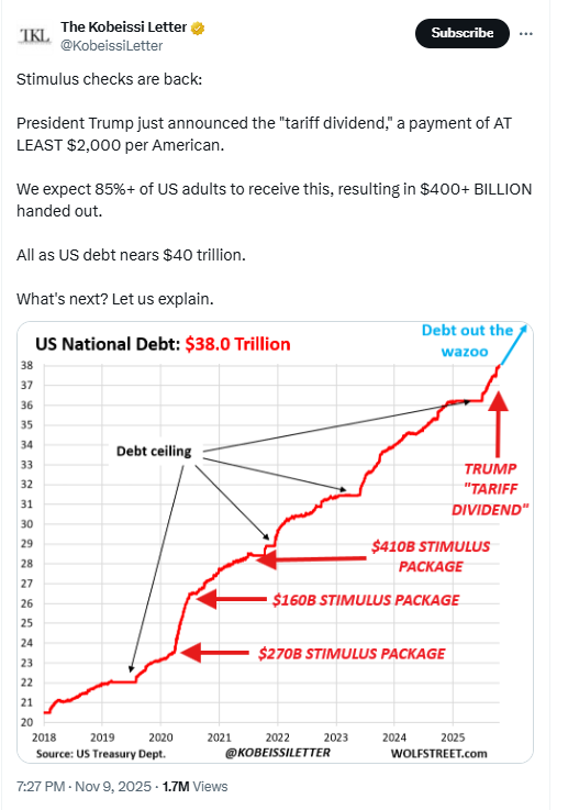 The Kobeissi Letter said the proposed Trump tariff dividend would add to the national debt and raise US inflation over time.