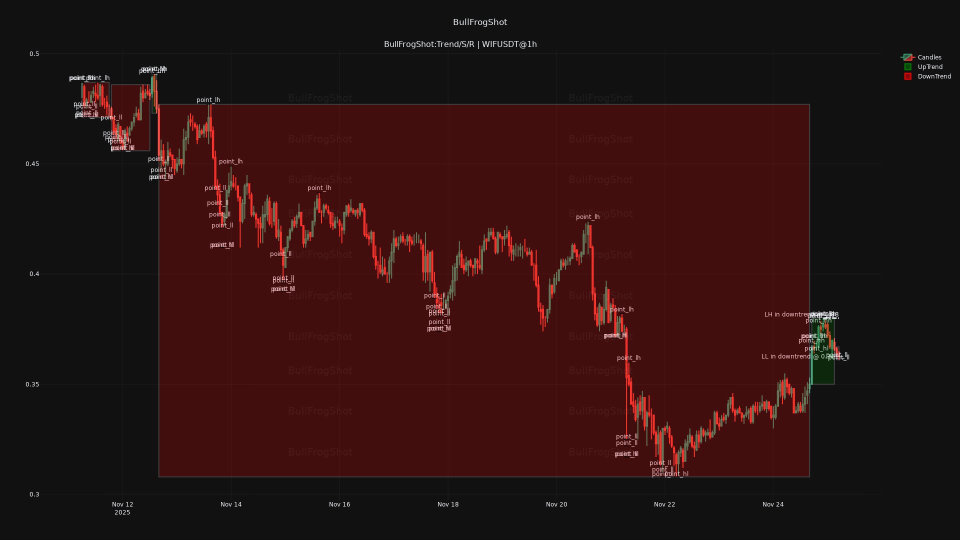 WIF is stuck in a tight band, holding firm above 0.361 dollars while repeated tests of the 0.38 dollar level fail to break through.