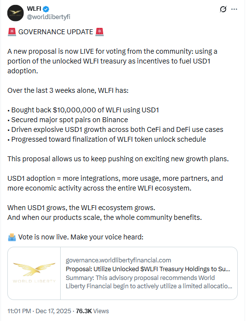 The proposal focuses on a 5 percent treasury unlock from the WLFI treasury. The project linked that move to expanding USD1 stablecoin adoption.